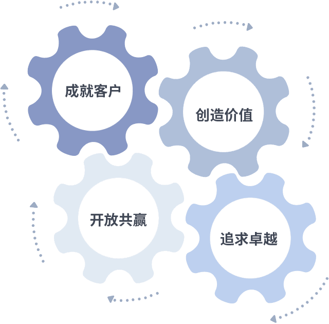 成就客户是一切决策的出发点,,,创造价值是衡量所有工作的标准,,追求卓越是我们做事做人的态度,,,开放共赢是我们的格局也是最终的结果。。价值观的齿轮环环相扣,,,推动着组织里的每个人不断向前。。